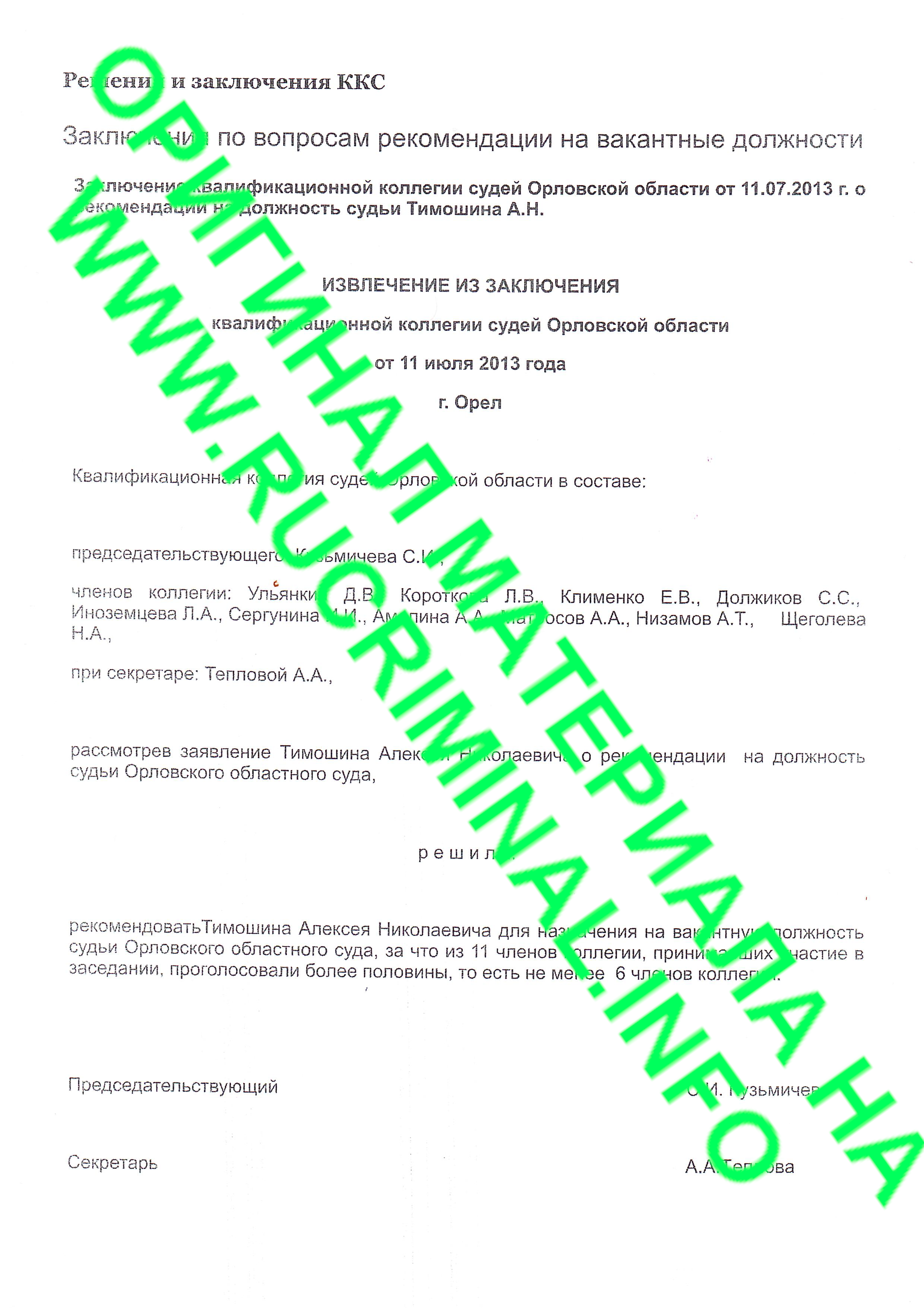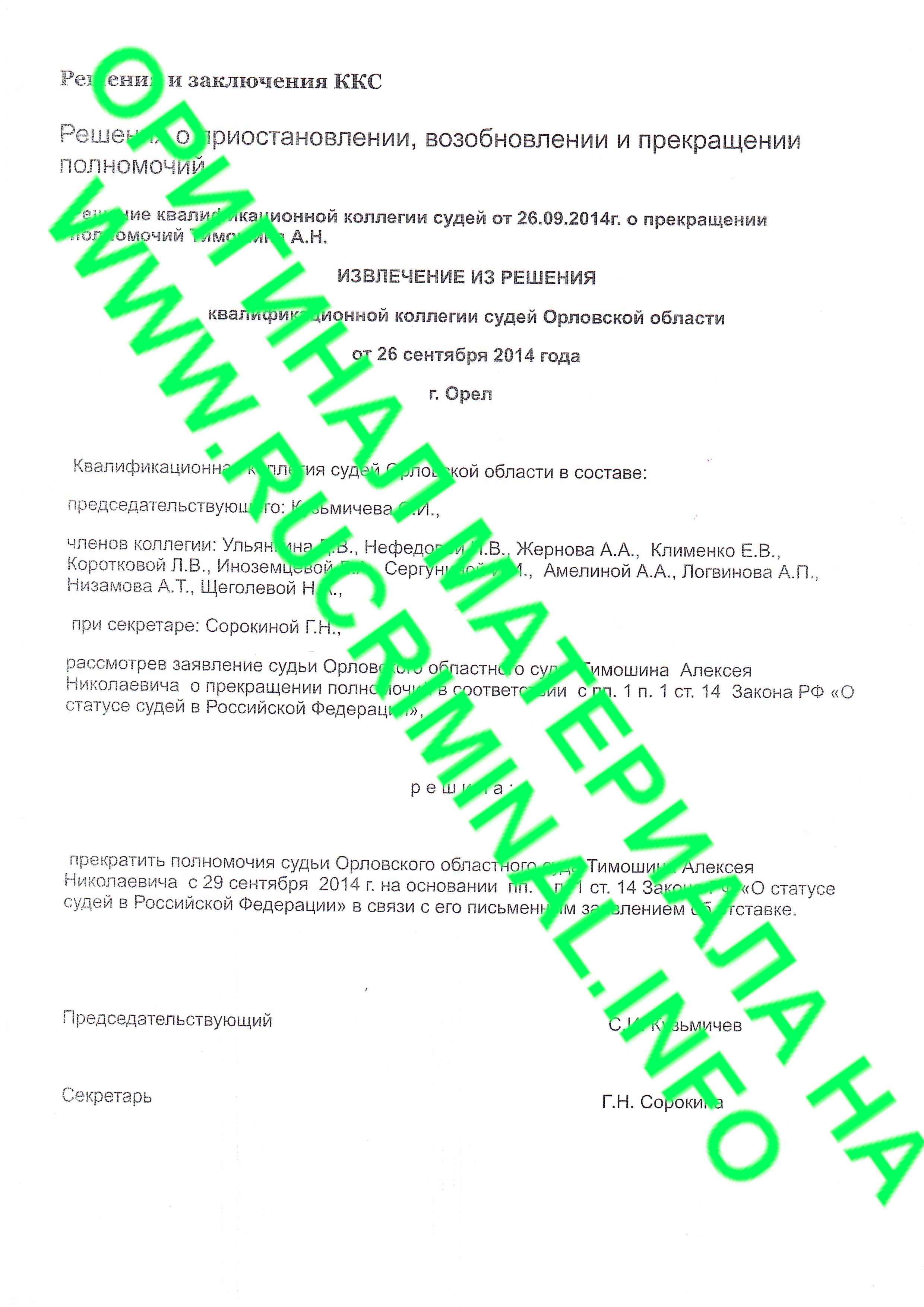 Однако, к осени 2014 года в карьере Тимошина-младшего что-то пошло не так. Согласно решения ККС Орловской области от 26.09.2014 года, которое оказалось в распоряжении Rucriminal.info, Алексей Тимошин слагает с себя полномочия судьи Орловского областного суда и подает в отставку согласно его же заявления.