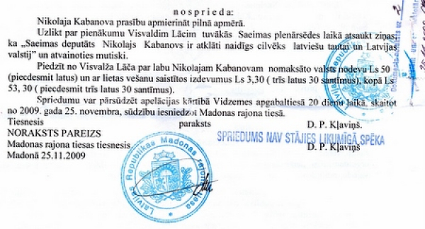 В день Лачплесиса, 11 ноября, являющегося, однако, рабочим днём, суд Мадонского района полностью удовлетворил гражданский иск депутата Центра Согласия Николая Кабанова к депутату зелёных крестьян Висвалдису Лацису об оскорблении чести и достоинства.