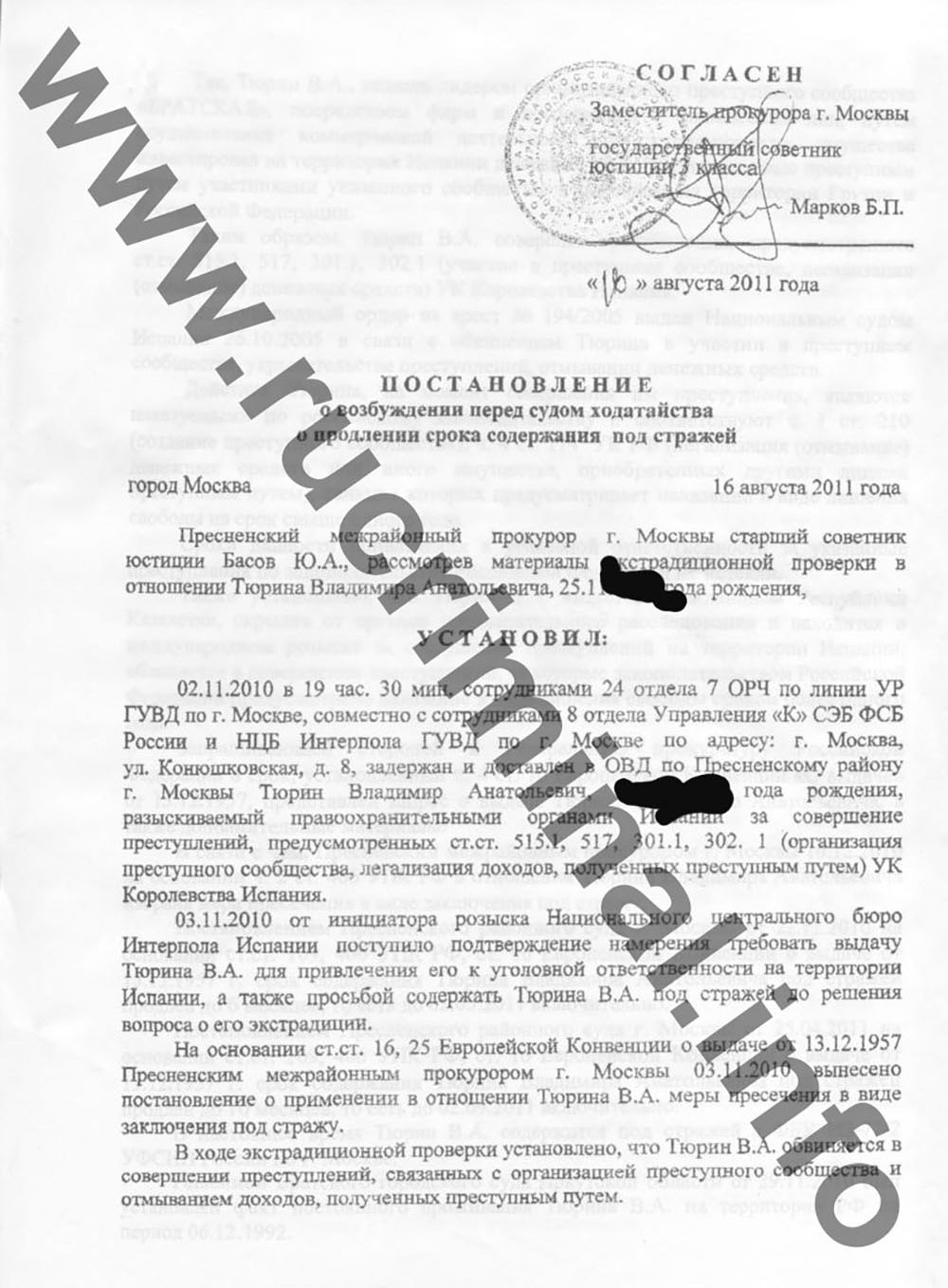 Международный ордер на арест выдан Национальным судом Испании 26.20.2005 в связи с обвинением Тюрина в участии в преступном сообществе, укрывательстве преступлений, отмывании денежных средств.