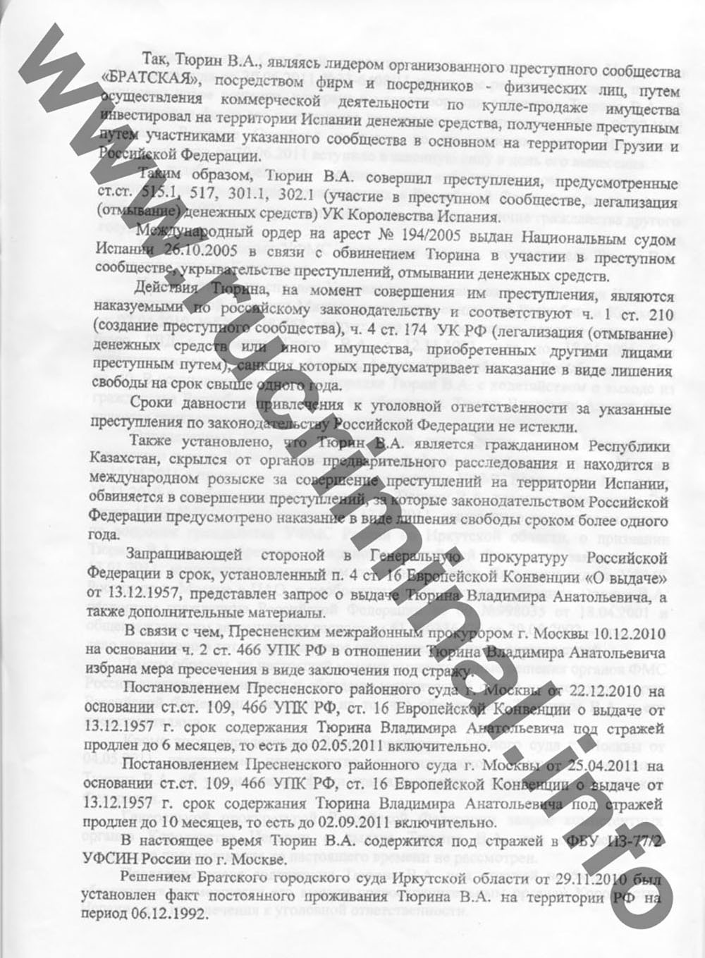 Также установлено, что Тюрин В.А. является гражданином Республики Казахстан, скрылся от органов предварительного расследования и находится в международном розыске за совершение преступлений на территории Испании…».