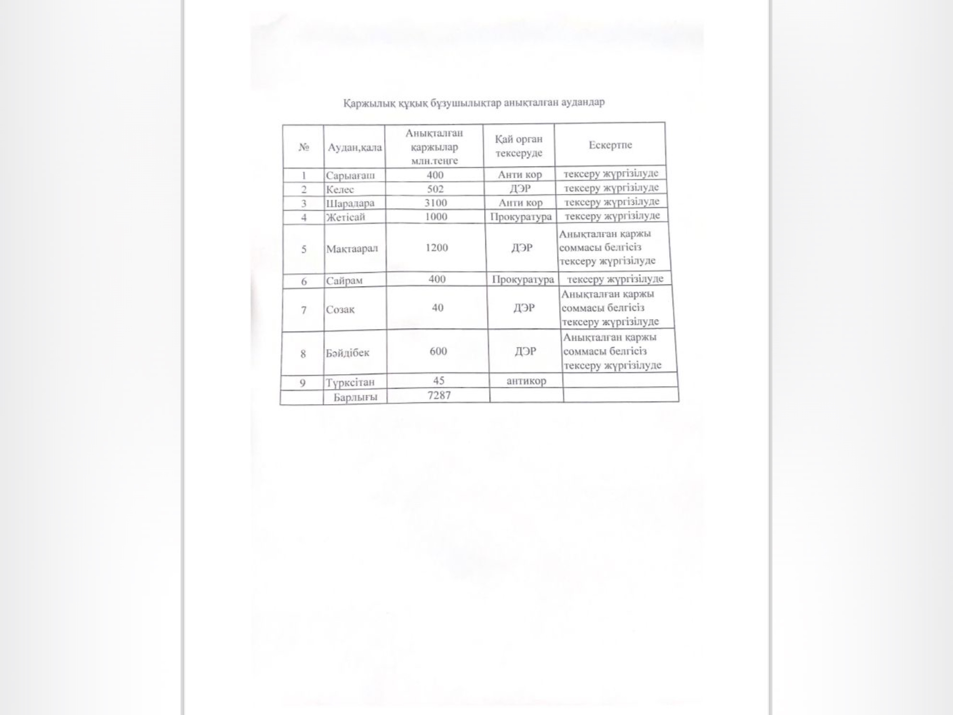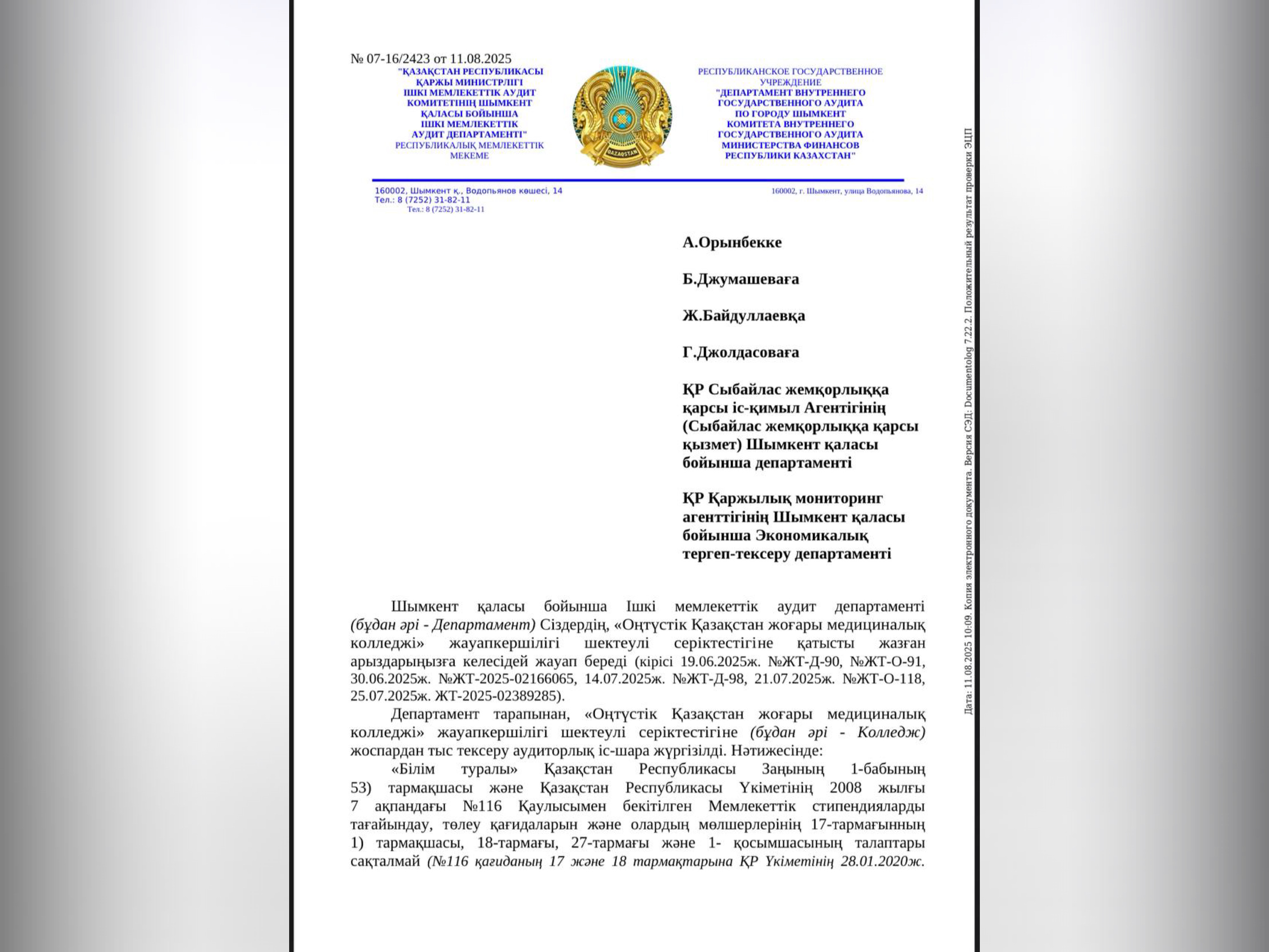 — Проведенным внутренним государственным аудитом ДВГА по городу Шымкент в ТОО «Южно-Казахстанский высший медицинский колледж» (далее — Колледж) установлены финансовые нарушения на сумму 204,1 млн. тенге, которые подлежат возмещению в бюджет, при этом в ходе аудита в бюджет взыскано 3,0 млн. тенге. Так, в нарушение пп. 53) ст. 1 Закона РК «Об образовании» и пп. 1) п. 17, п. 18, п. 27 и приложения №1 Постановления Правительства РК от 07.02. 2008 года №116 «Об утверждении Правил назначения, выплаты и размеров государственных стипендий» в течение 2021-2025 годов Колледж незаконно присваивал бюджетные средства, предоставляемые обучающимся для частичного покрытия расходов на питание, проживание и приобретение учебной литературы по неподписанным платежным ведомостям – расходным кассовым ордерам. В 2021 году на 11,9 млн. тенге (71 студент), в 2022 году на 19,1 млн. тенге (160 студентов), в 2023 году на 43,8 млн. тенге (235 студентов), в 2024 году на 78,3 млн. тенге (210 студентов) и в 2025 году (за 6 месяцев) 50,0 млн. тенге (206 студентов), итого необоснованно присвоено на сумму 203,1 млн. тенге по 286 студентам, — сообщили в департаменте.