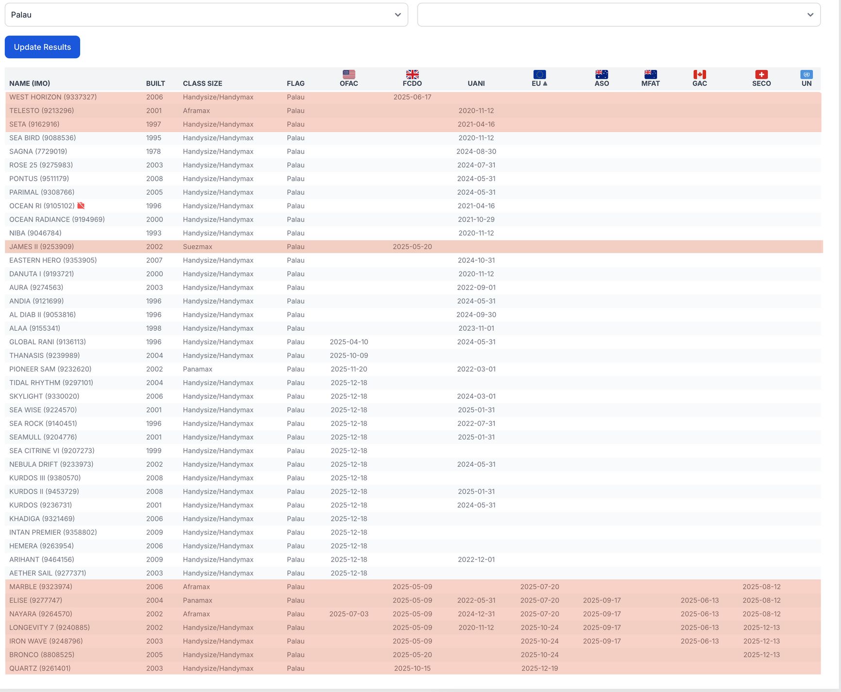 В базу внесены данные о судах под санкциями (не одновременными) Великобритании (FCDO), ЕС, США (OFAC), американской НПО United Against Nuclear Iran (UANI), Австралии (ASO), Новой Зеландии (MFAT), Швейцарии (SECO) и ООН.